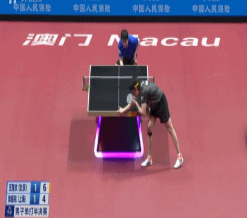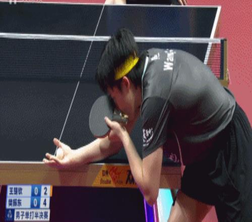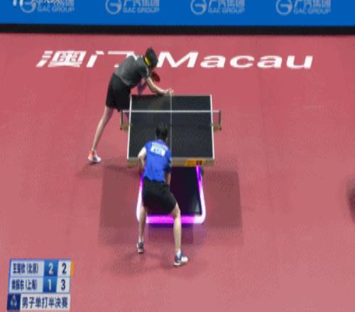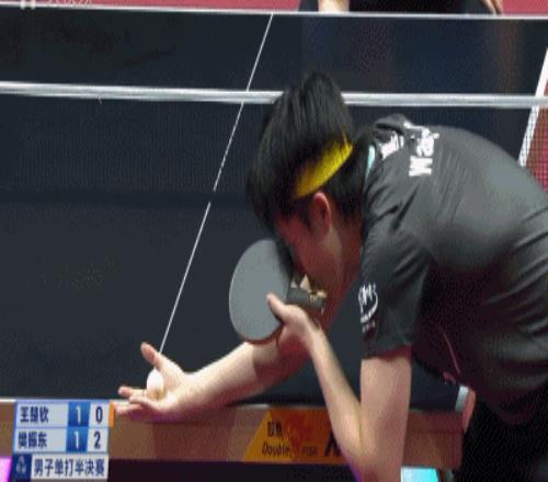 但是王楚钦在发球环节给樊振东极大压力——1比3,王楚钦发了一个台角保护的半出台,樊振东一吊,被早等在位置的王楚钦一个倒地爆冲。