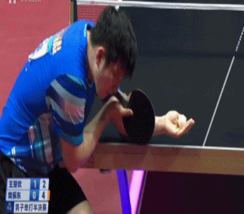 后面被王楚钦连续两个倒地爆冲(上台一个被防回去一个)之后,樊振东变了一个长球,又被王楚钦直接侧身得分。